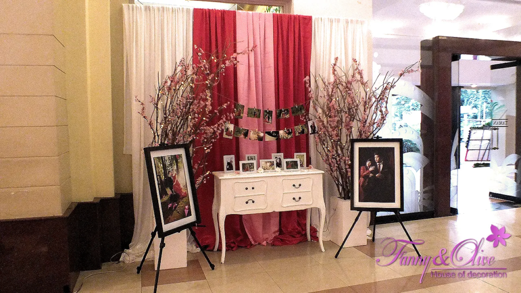 Tirai berwarna merah, pink dan putih digunakan sebagai latar belakang di area penerima tamu, photo booth dan foto galeri yang berada tepat setelah pintu masuk gedung.