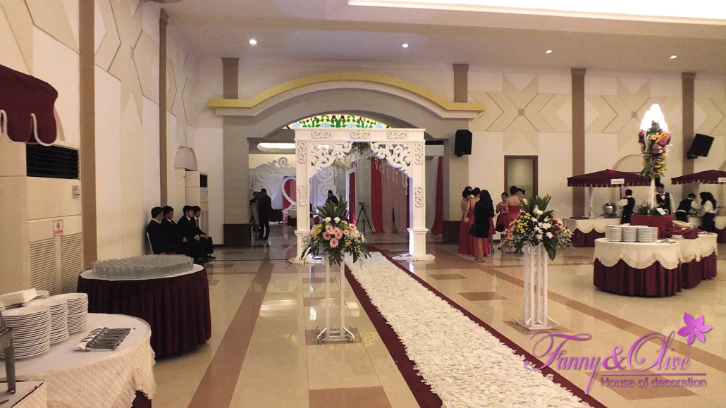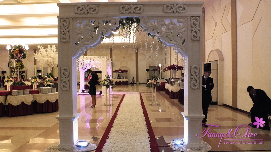 Tidak seperti biasanya, Wedding Gate terbuat dari ukiran styrofoam simetris yang dibentuk seperti gapura dengan aksesn sedikit bunga juntai di bagian atasnya.