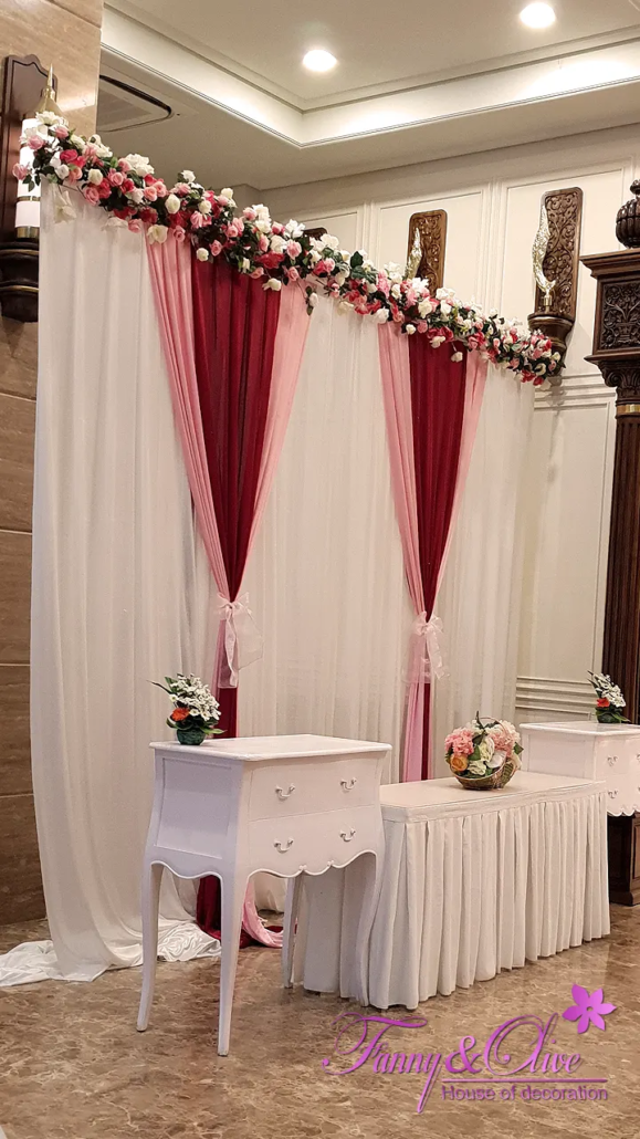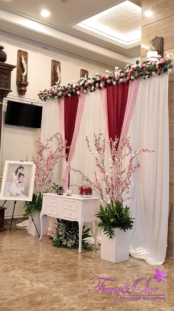 Dinding latar bagian tengah dipenuhi kain kerut berwarna merah, di bagian atasnya ada aksen ukiran styrofoam berbentuk oval berdiri dengan rangkaian bunga artifisial di tengahnya.