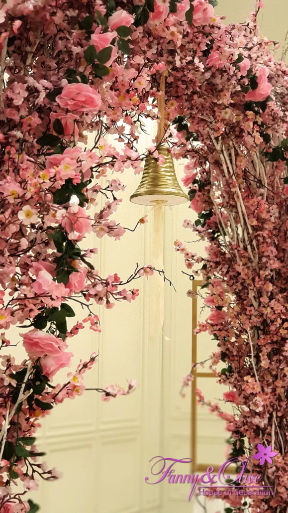 Wedding Gate berbentuk persegi dari ranting-ranting putih kering berbalutkan ranting bunga meyhwa artifisial dengan lonceng di tengahnya untuk ritual mazel tov.