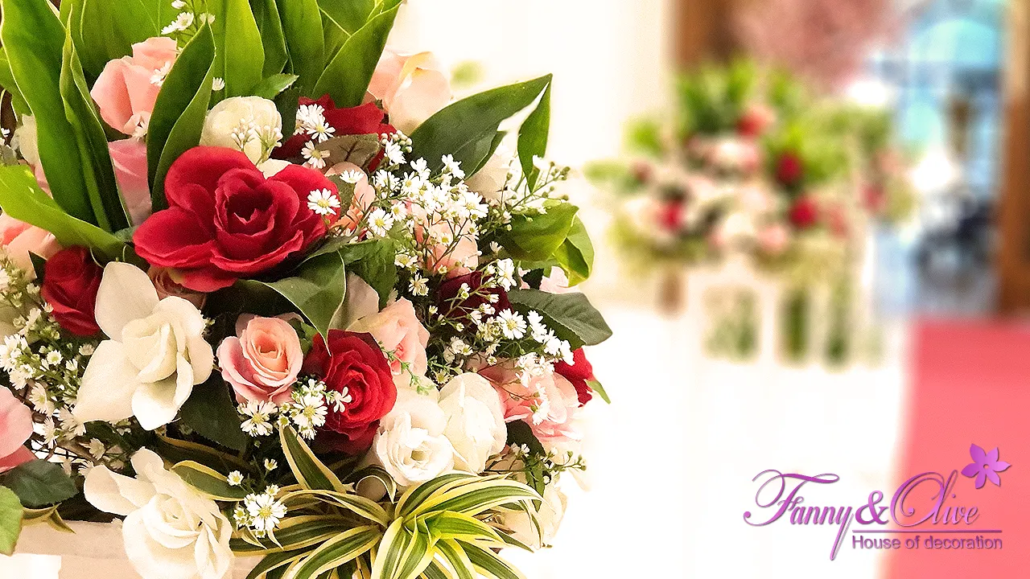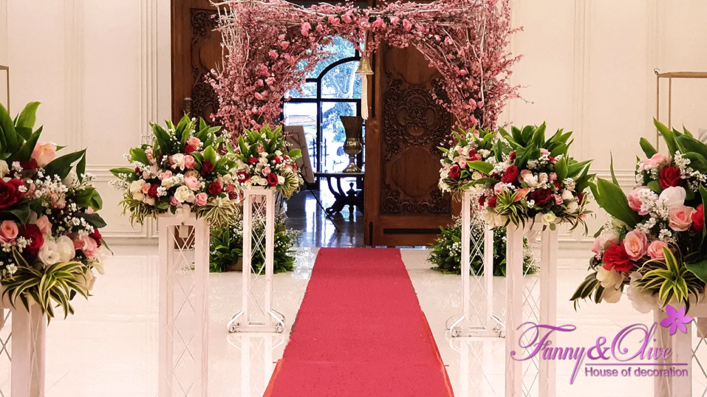 Tiga pasang standing flower dengan rangkaian bunga campuran organik dan artifisial diletakkan sejajar di samping kiri dan kanan karpet menuju panggung pelaminan.