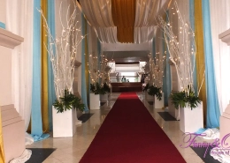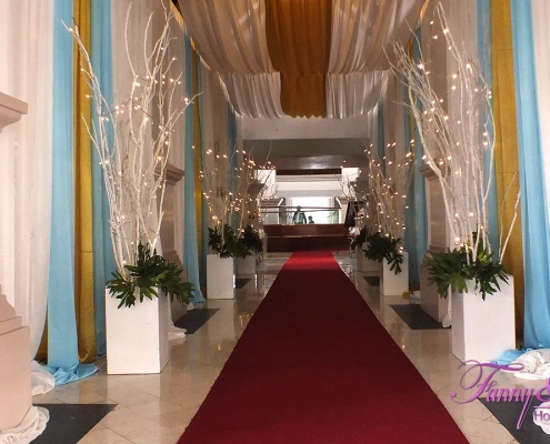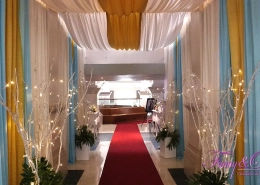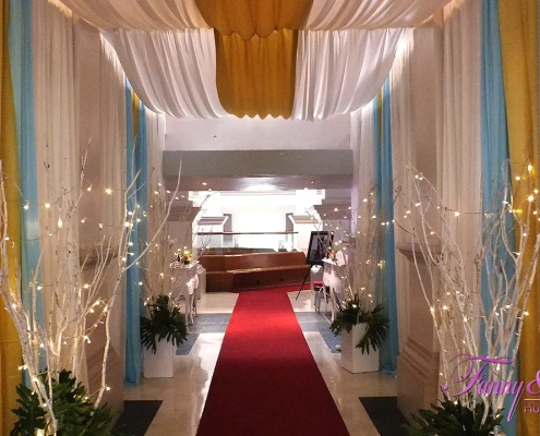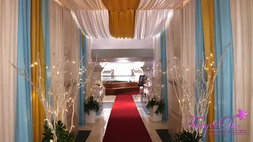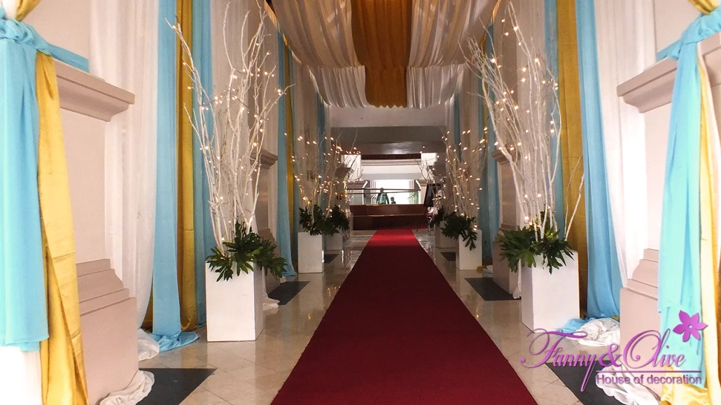 Tirai berwarna putih, biru muda dan emas menghiasi dinding kiri dan kanan lorong gedung mulai dari pintu masuk menuju area penerima tamu.