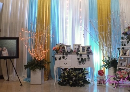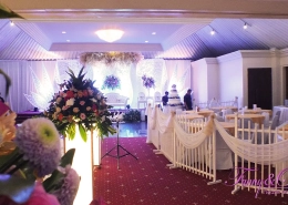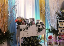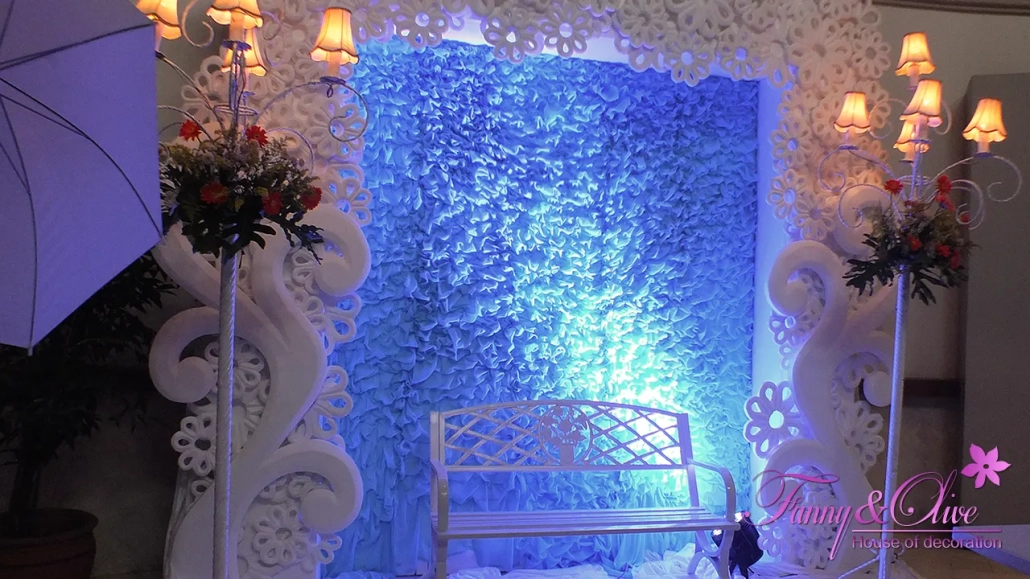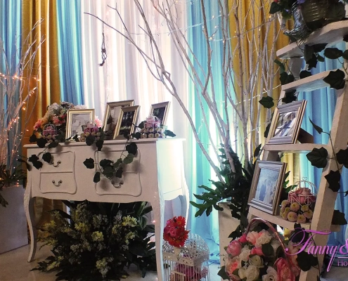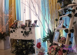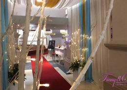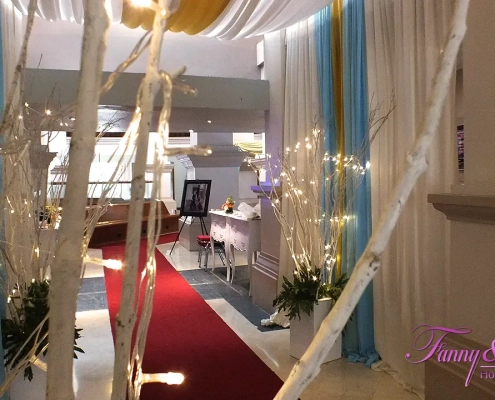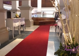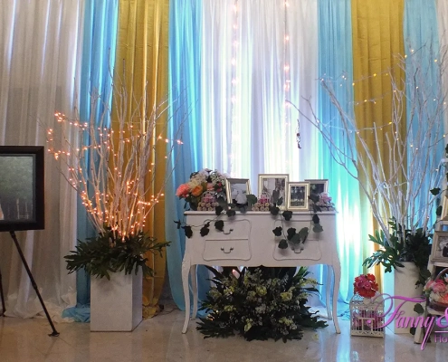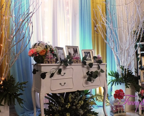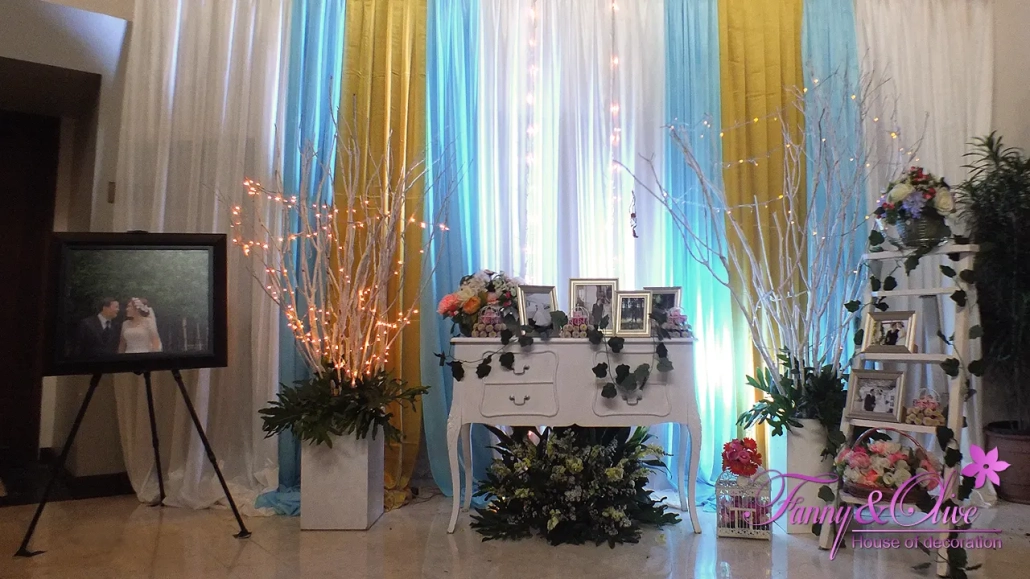Di sisi sebelah kanan sebelum pintu masuk ruang resepsi ada foto galeri dengan latar tirai berwarna senada seperti di lorong masuk, putih, biru muda dan emas.
