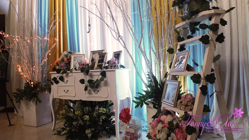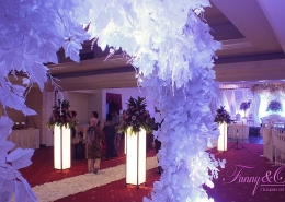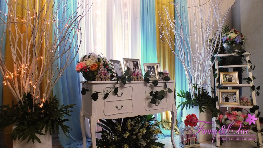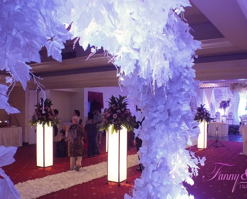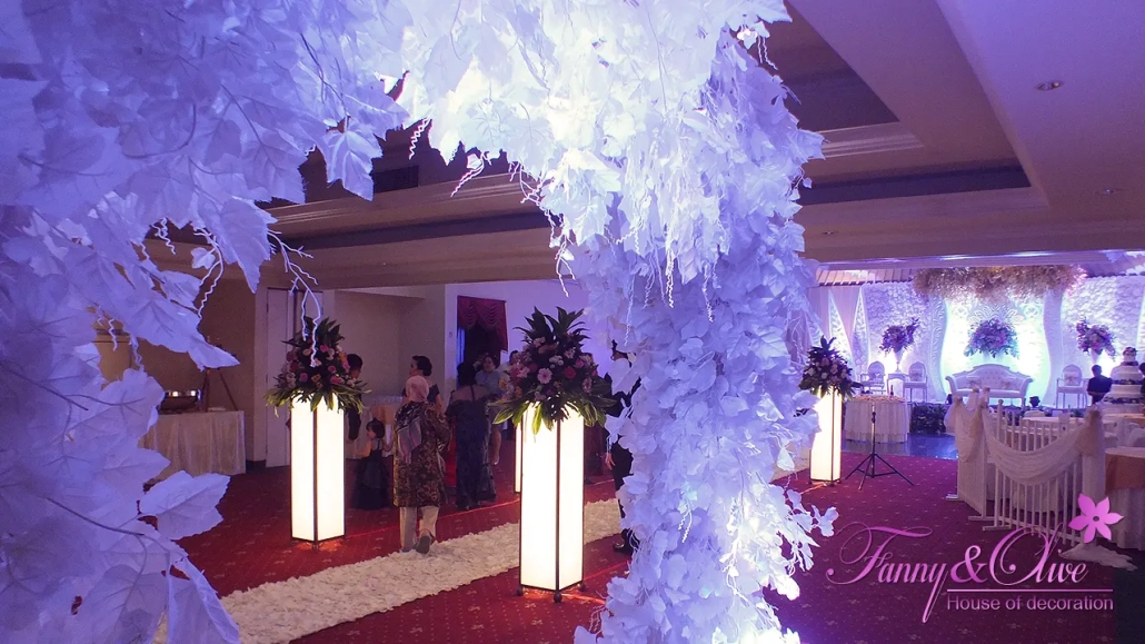 Tiga pasang kotak ranting kering berwarna putih dengan lampu juntai diletakkan di sisi kiri dan kanan.