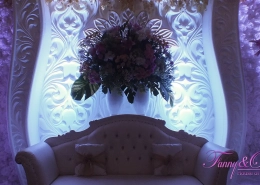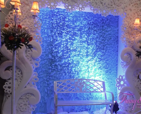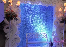 Latar belakang panggung pelaminan mirip bunga teratai, di sisi luar kiri dan kanan terdapat lima buah ukiran styrofoam berbentuk kelopak luar bunga teratai.