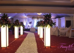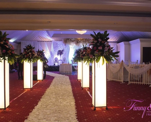 Tiga pasang pilar neon box dengan rangkaian bunga organik di atasnya berjajar rapi di sisi kiri dan kanan rose petal.