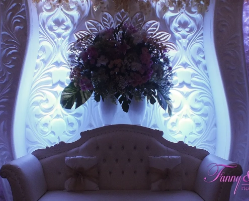 Tiga buah rangkaian bunga organik, satu di belakang sofa mempelai, dan dua buah lainnya di belakang sofa orang tua / wali mempelai.