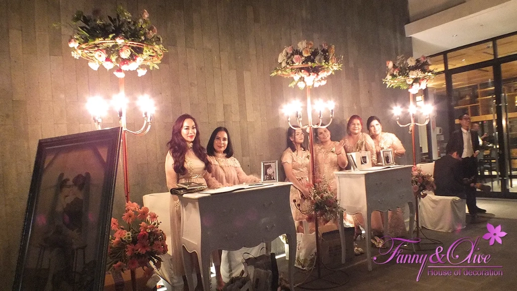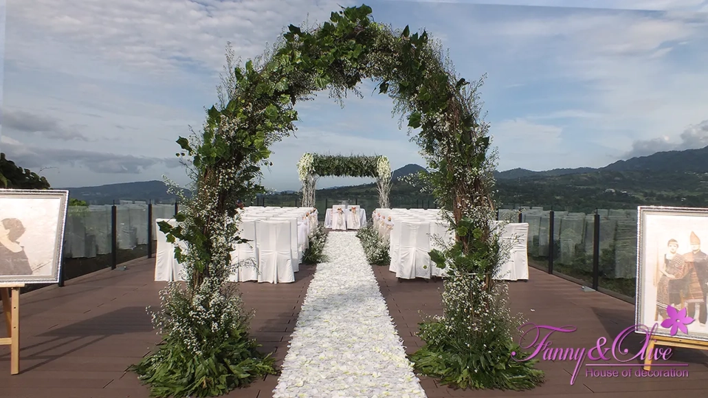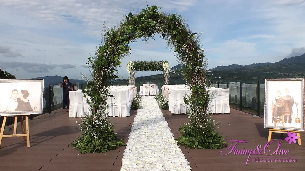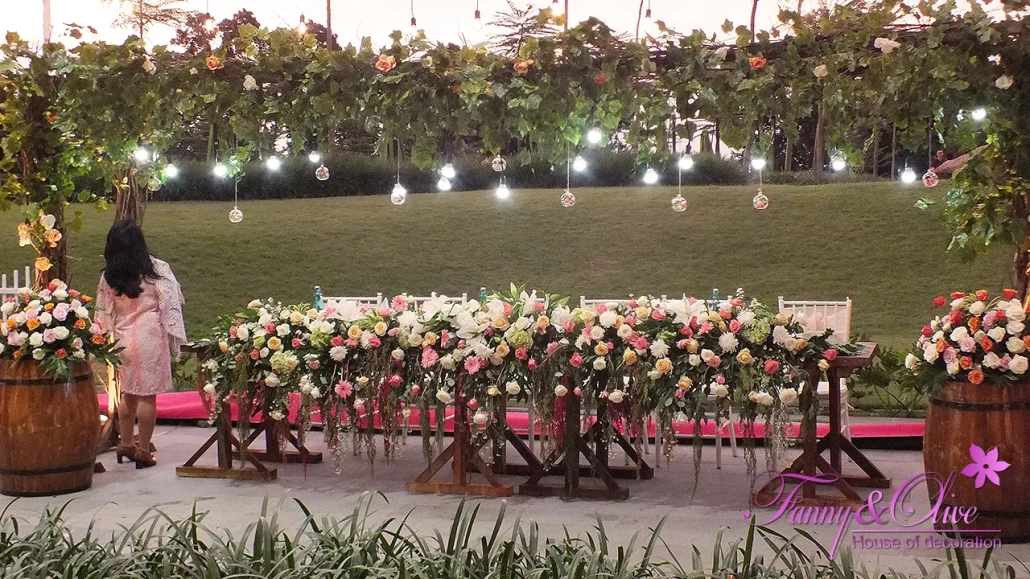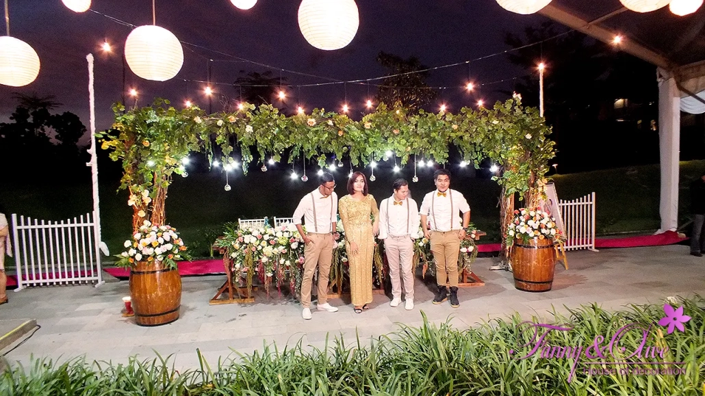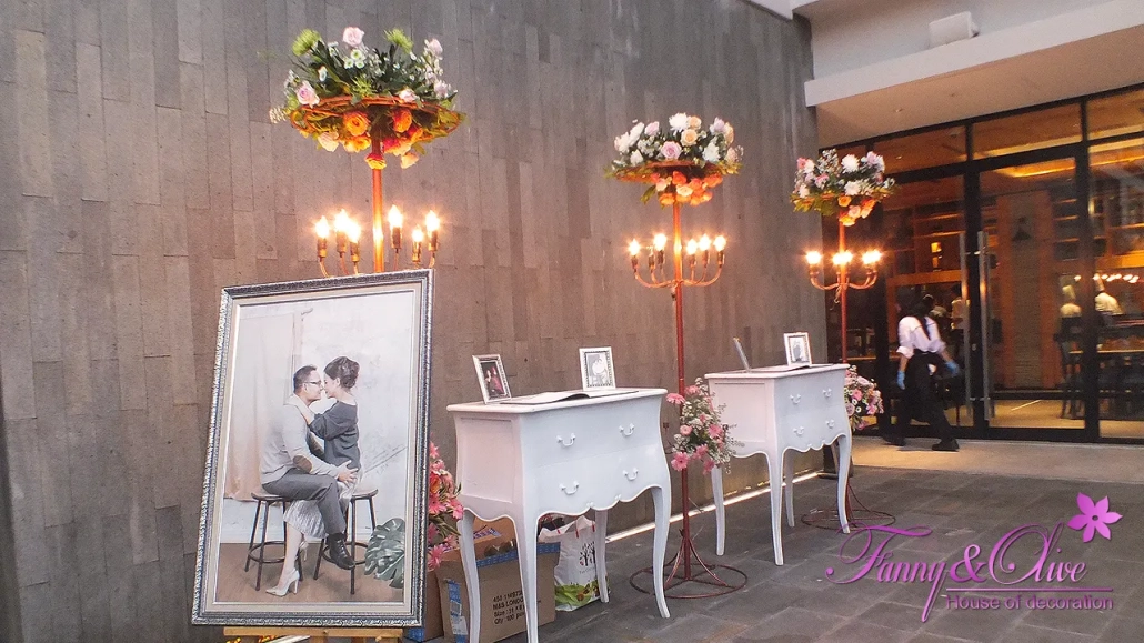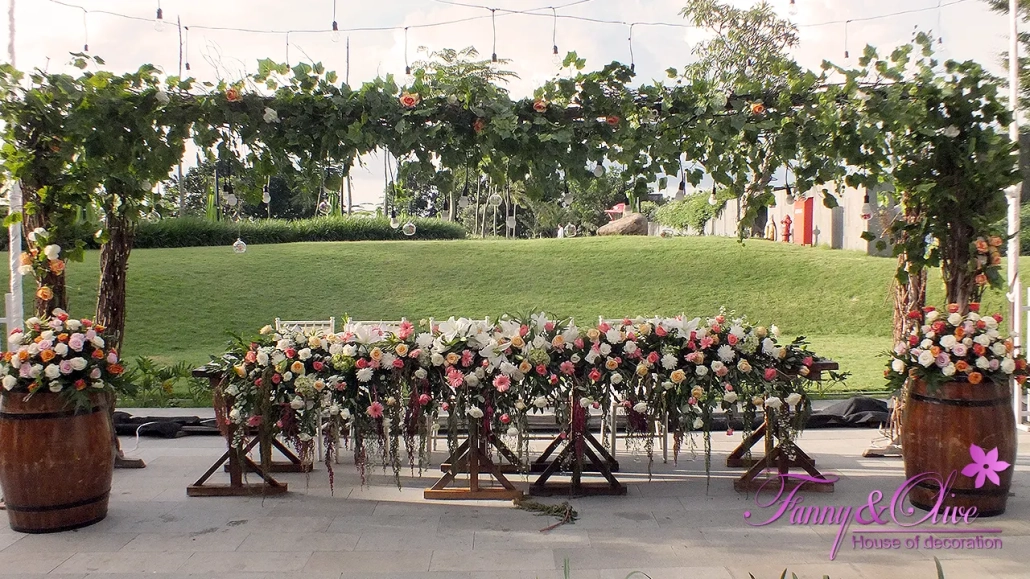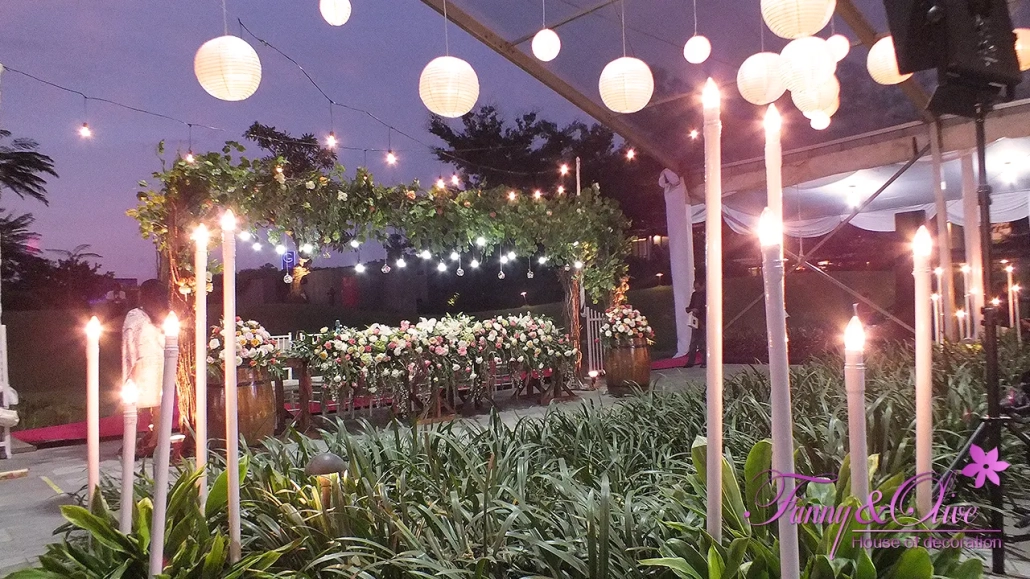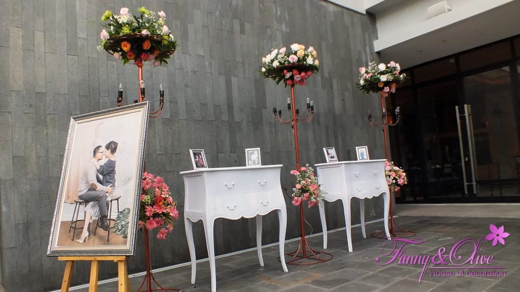 Diapit tiga buah tiang dengan rangkaian bunga organik di bagian atas dan bawah, dilengkapi pula dengan lampu pijar warna kuning.