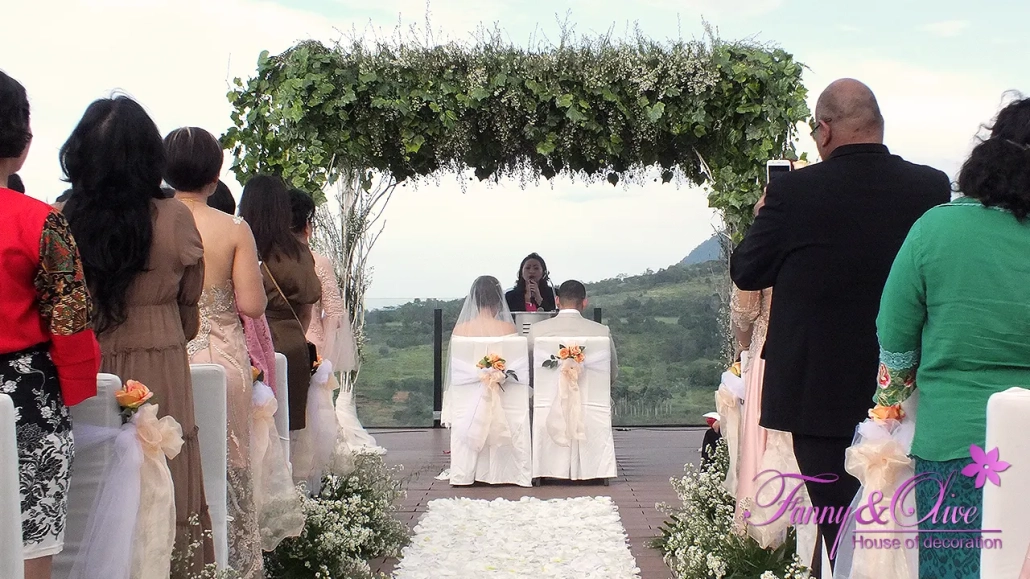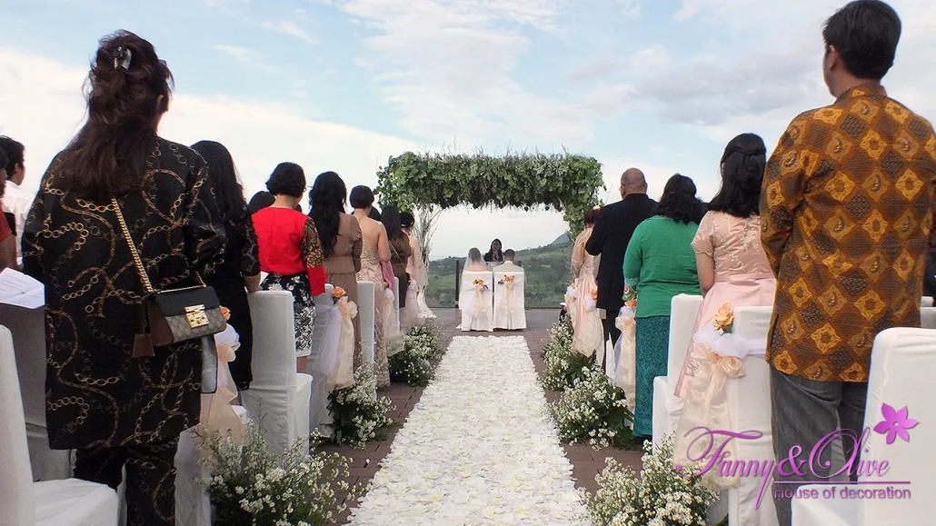 Gazebo dengan tiang ranting-ranting kering berwarna putih dan atap yang dipenuhi dengan bunga pikok menjadi pusat acara pemberkatan tersebut.
