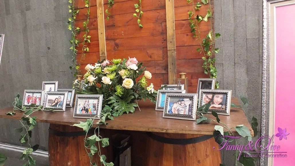 Latar belakang foto galeri pun terbuat dari rangkaian papan kayu berwarna natural senada dengan drum kaki mejanya.