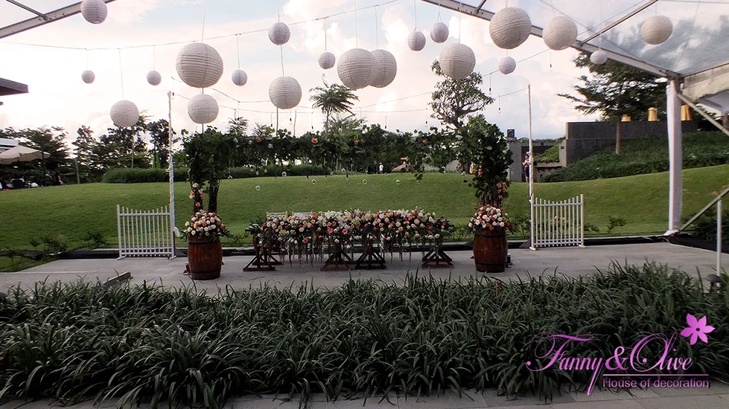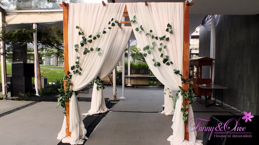 Memasuki area resepsi, tampak gazebo dengan tiang-tiang kayu dan tirai putih yang dihiasi daun daun juntai.