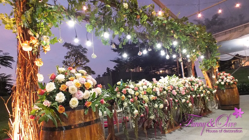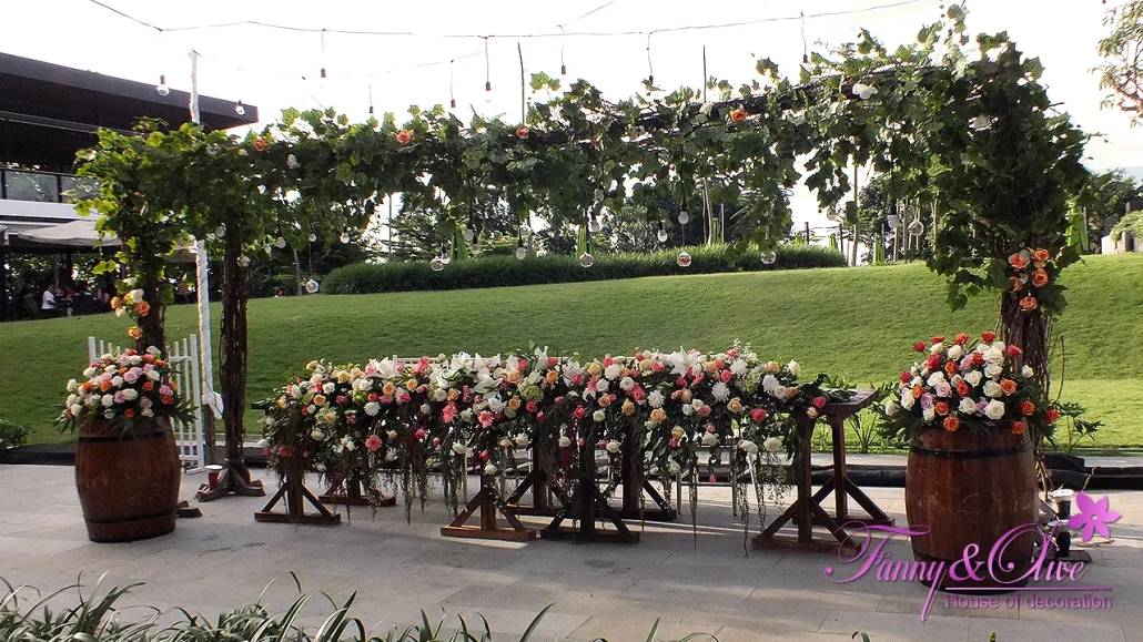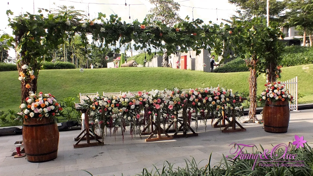 Kayu, tanaman, berbagai macam bunga organik menjadi materi utama pada dekorasi pernikahan ini.