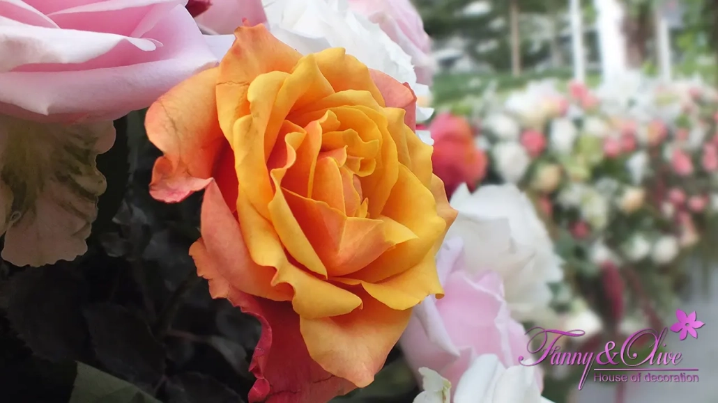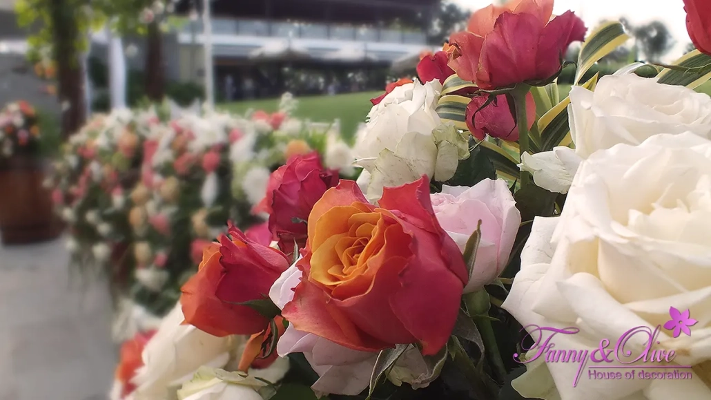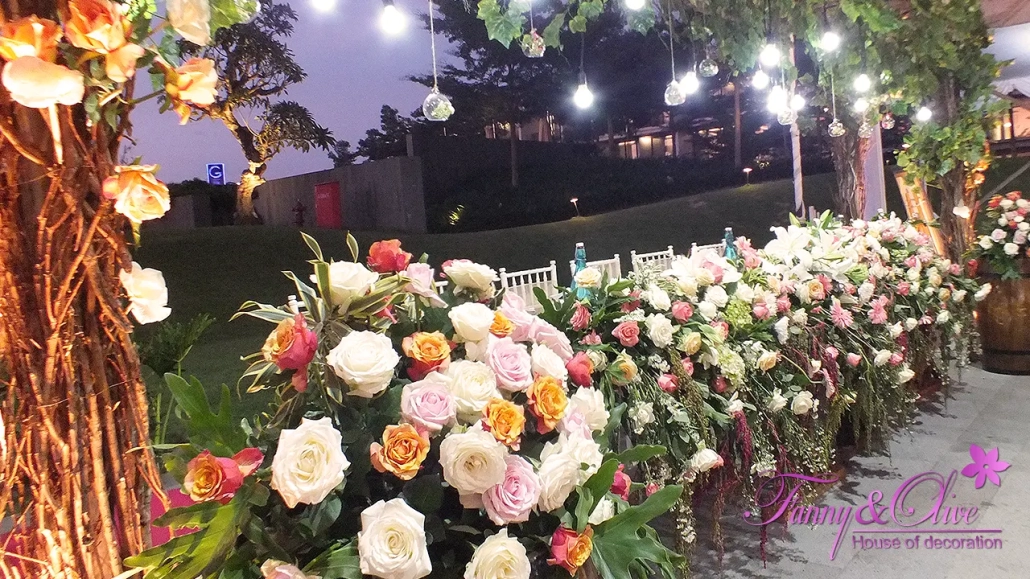 Rangkaian berbagai macam warna bunga mawar menghiasi bagian depan meja tersebut.