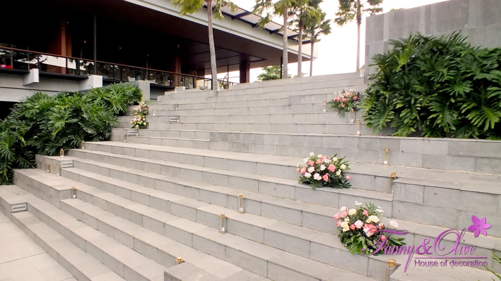 Kami memasang beberapa rangkaian bunga pada anak tangga di area resepsi.
